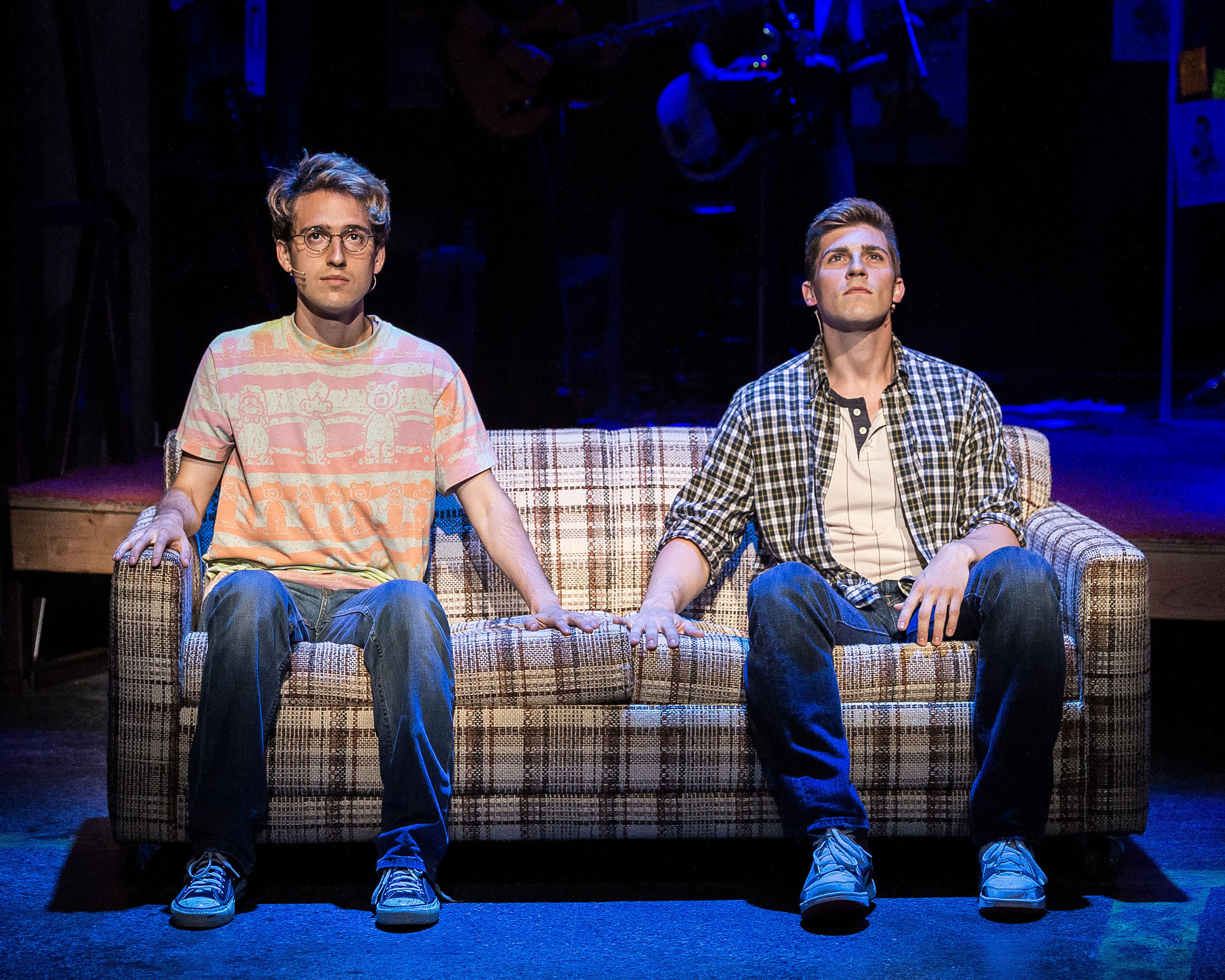 I was unfamiliar with Sweet’s music prior to seeing Girlfriend, and it was a very pleasant surprise—catchy, sweet rock songs and ballads that fit the 18-year-old characters well. Rather than having the characters burst randomly into song, the music was incorporated into the plot. Mike is a guitar player, and he and Will would make a point out of “putting on” or playing the songs and bonding over the music so that all of the singing was actually a part of the characters’ lives. I was incredibly impressed by how well Almond’s book, which I found to be the standout of the musical, incorporated the songs into the narrative. While the music, sung wonderfully by Bach, Hansen, and the onstage band, was solid, the characters shined brightest in the simple dialogue scenes. The set is not extravagant—a couch center stage transforms into a car, a bed, and basically anything that is needed, and there are few props aside from a CD player, a guitar, and phones. As it should be, there are few distractions from the characters’ inner turmoil and budding relationship.