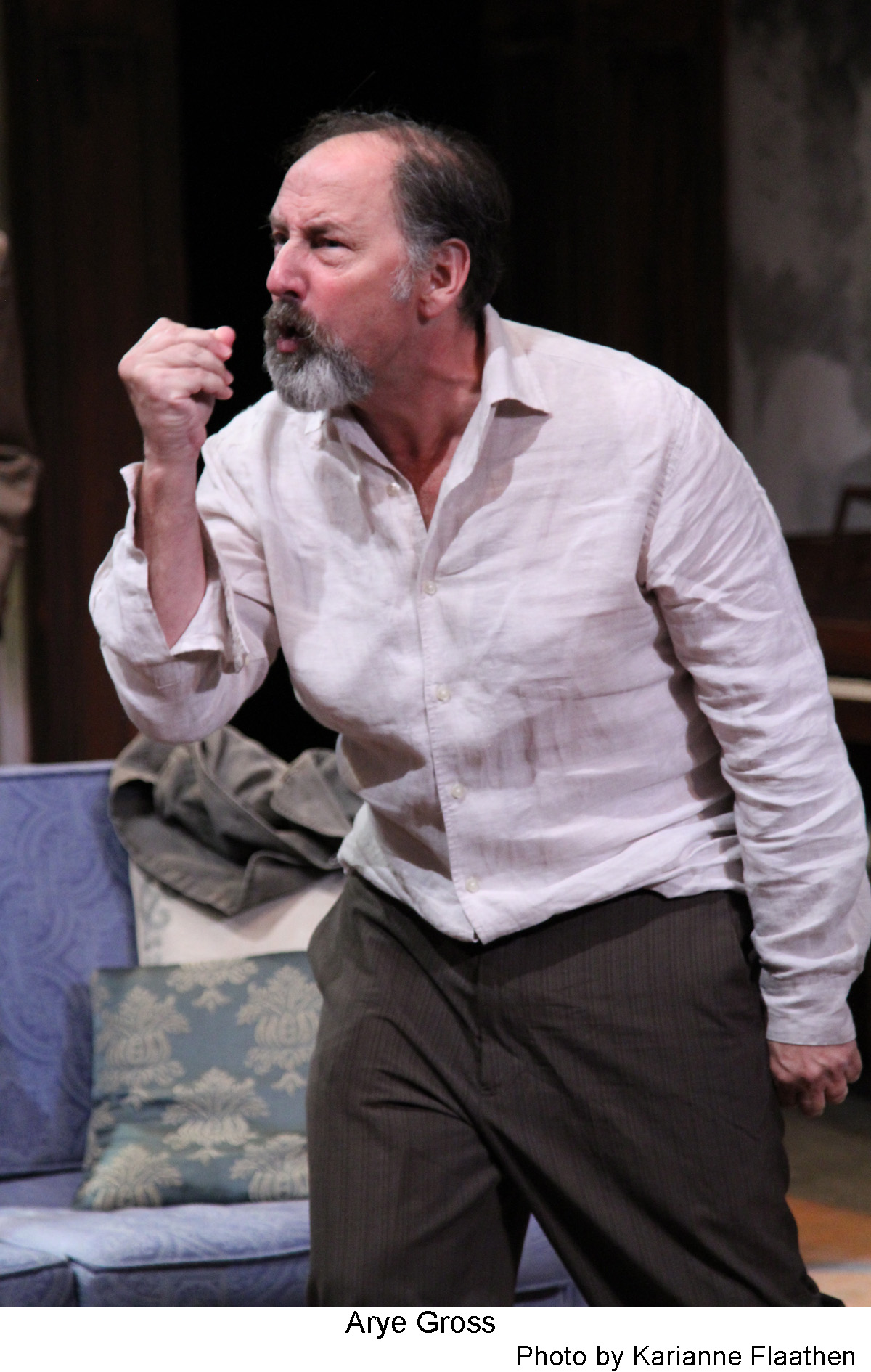 The plot set-up of Uncle Vanya is quite simple. An elderly professor, Serebryakov (Harry Groener) and his significantly younger new wife, Yelena (Rebecca Mozo) return to their country estate for the summer, causing a bit of upheaval in the lives of their family members and friends who live there. The titular Uncle Vanya (Arye Gross) is the brother of Serebryakov’s first wife and has spent years wallowing in his own misery while managing his brother-in-law’s estate. He is immediately taken with the beautiful Yelena, as is Astrov (Andrew Borba), a doctor who spends a lot of time at the family’s home. Sonya (Shannon Lee Clair), Serebryakov’s kind yet “plain” daughter, has a hopelessly unrequited crush on Astrov. Vanya’s mother, Maria (Mimi Cozzens), a poor local man, Telegin or “Waffles” for his pockmarked skin (Clay Wilcox), a nurse, Marina (Dawn Didawick), and a workman, Yefim (Paul Baird) round out the inhabitants and frequent visitors of the estate.